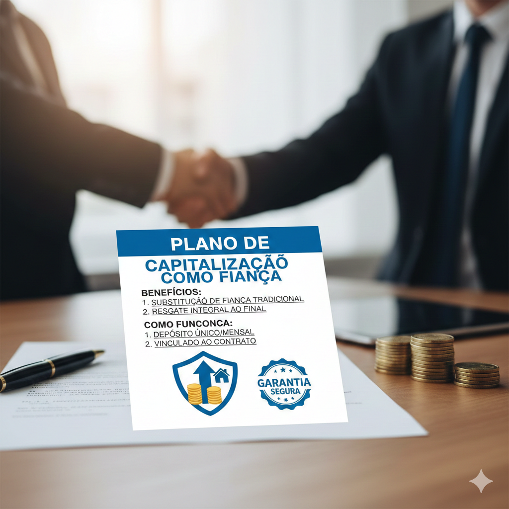O título de capitalização para aluguel é uma garantia locatícia que substitui o fiador tradicional. O inquilino adquire um título junto a uma instituição financeira, com valor geralmente entre 3 e 12 aluguéis, que fica retido durante o contrato e é devolvido ao final, corrigido, se não houver inadimplência.